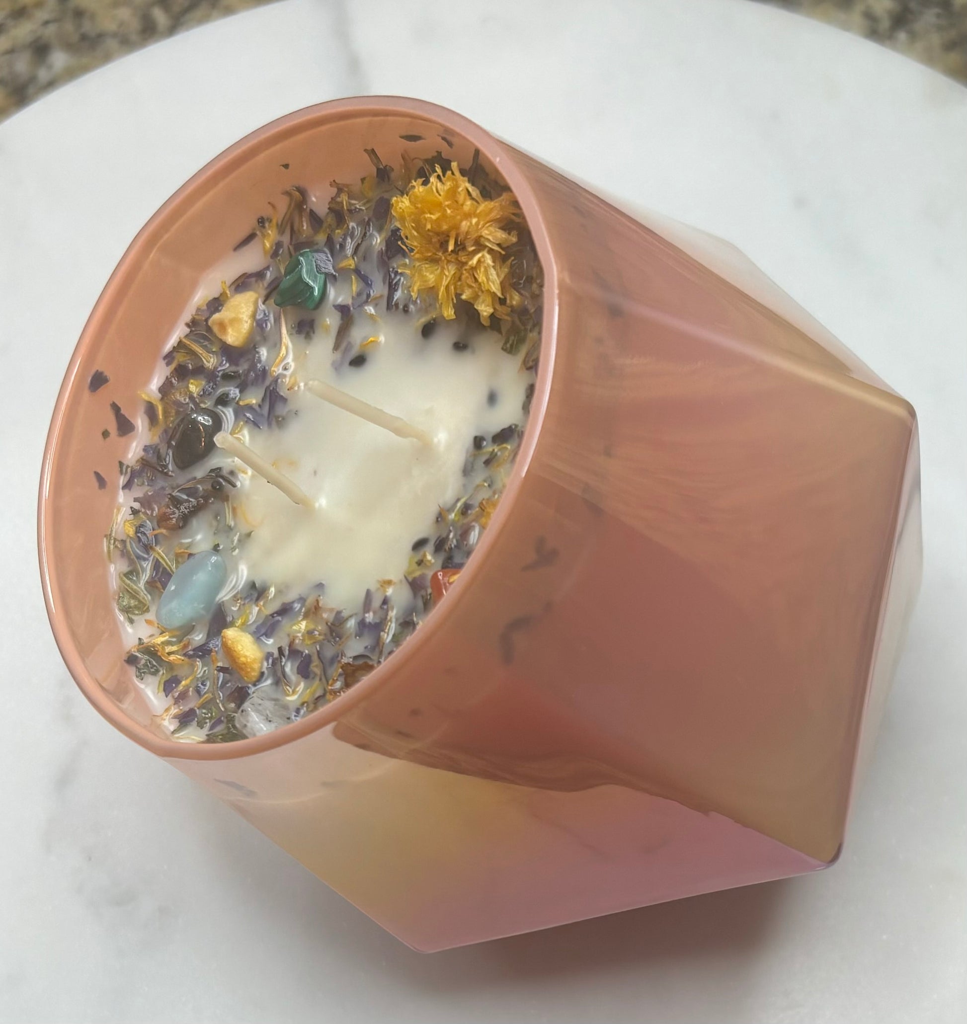 - Candles infused with rainbow moonstone crystal chips, clear quartz crystal chips, calendula flower, cinnamon, rosemary, Egyptian blue lotus flower, and lavender flower.
