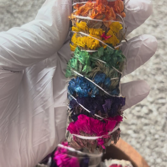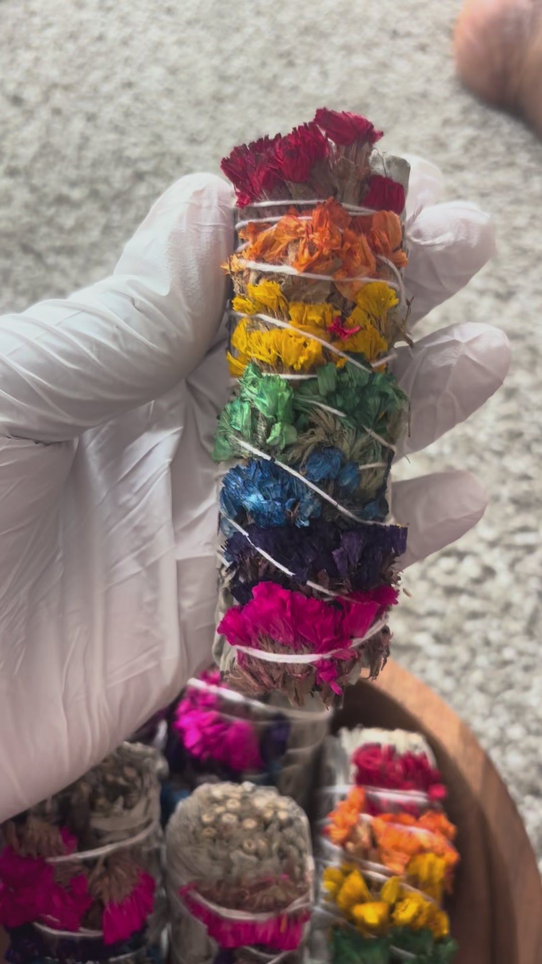 Organic white sage bundle with 7 chakra sinuata flowers (Bundle includes 3 4” sage wands)